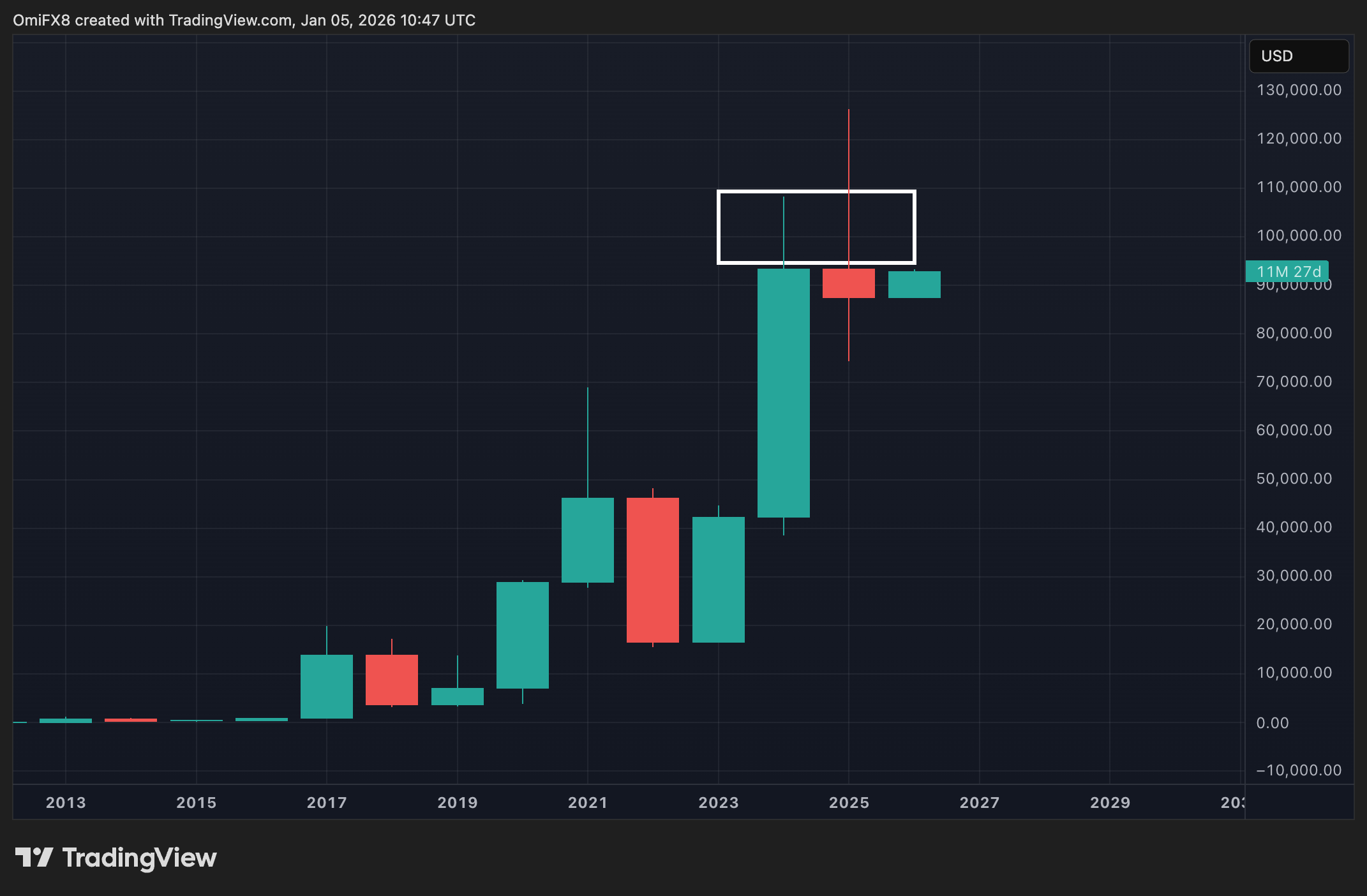 • The chart shows BTC's yearly price swings in candlestick format.