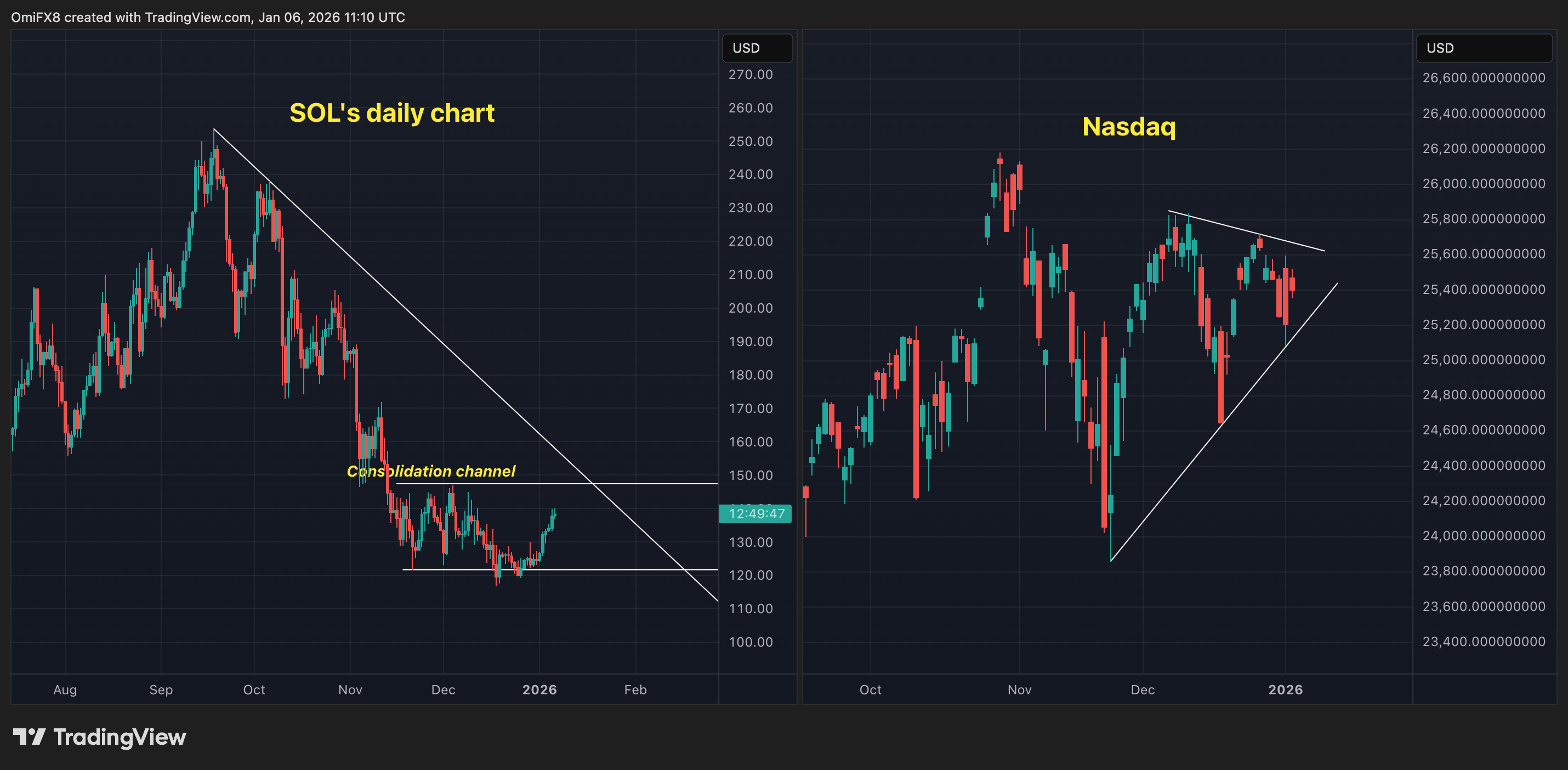 - The chart shows SOL's and Nasdaq's daily price swings in candlestick format.