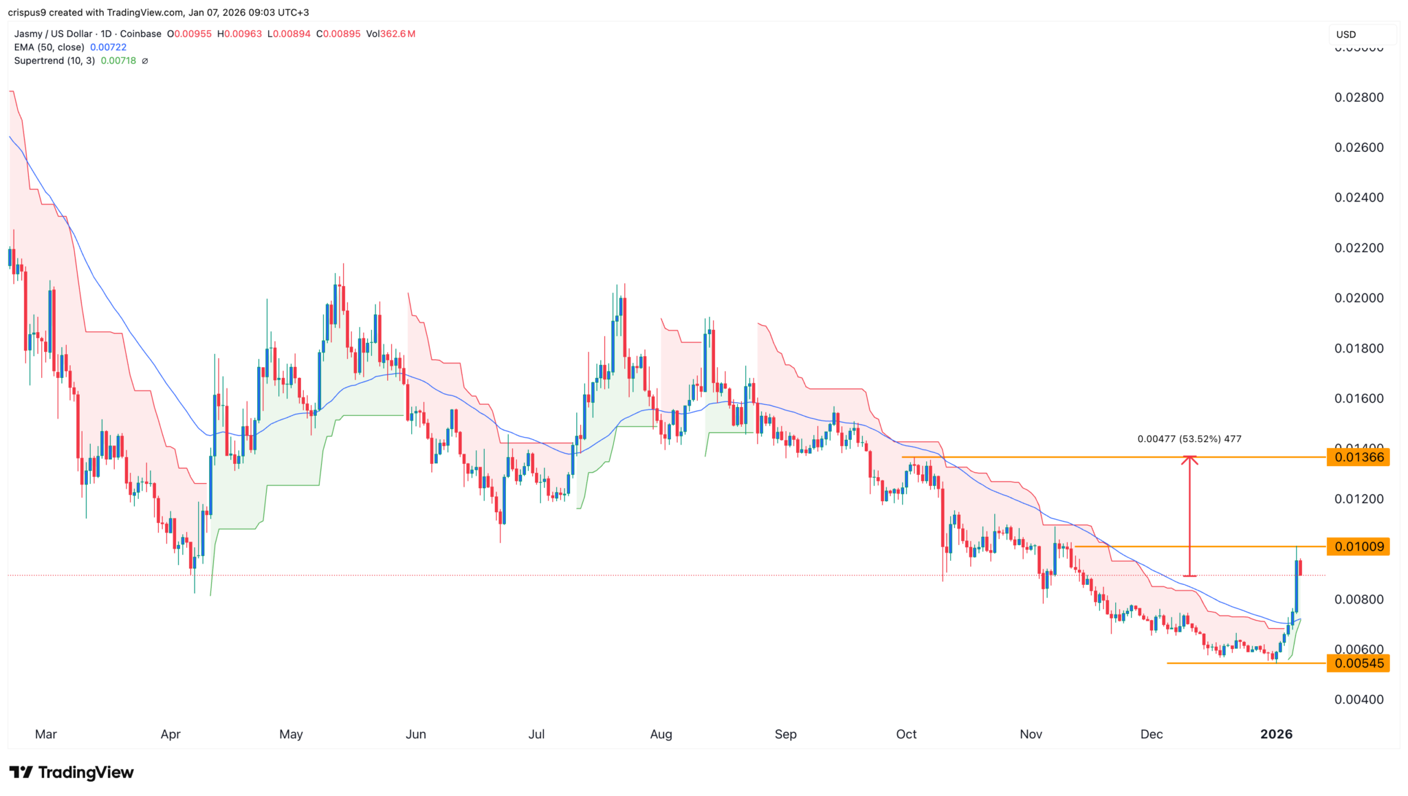Jasmy, a popular cryptocurrency known as Japan’s Bitcoin, has also started the year well. It jumped from a low of $0.00545 last week to a high of $0.0100, its highest point since November 11.