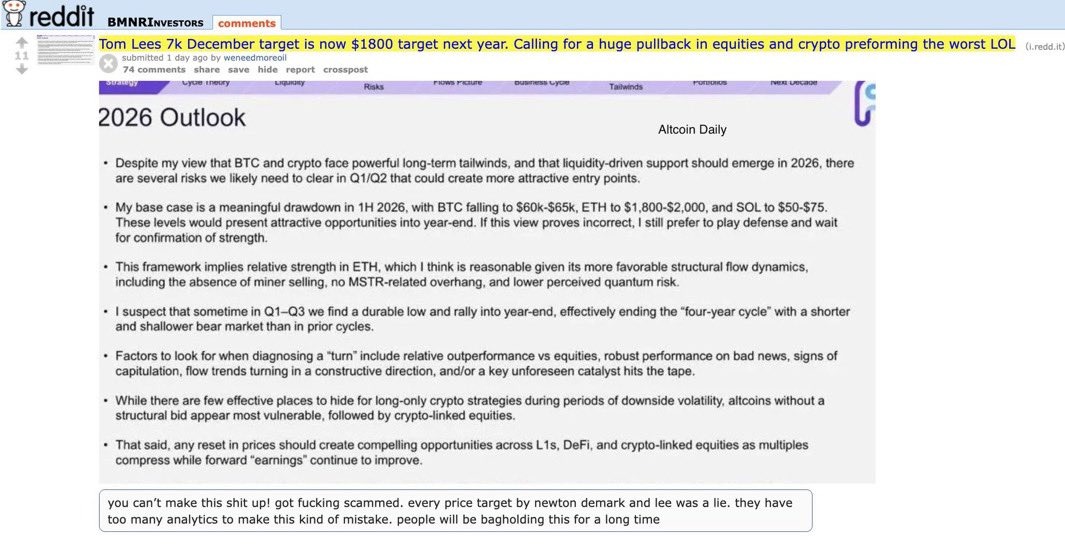 While the founder of Hong Kong-based investment firm Trend Research, Jack Yi, said he was “bullish” on crypto for the first half of 2026, Fundstrat Global Advisors predicted a local Ether bottom of around $1,800 during the first quarter of the year, Cointelegraph reported.