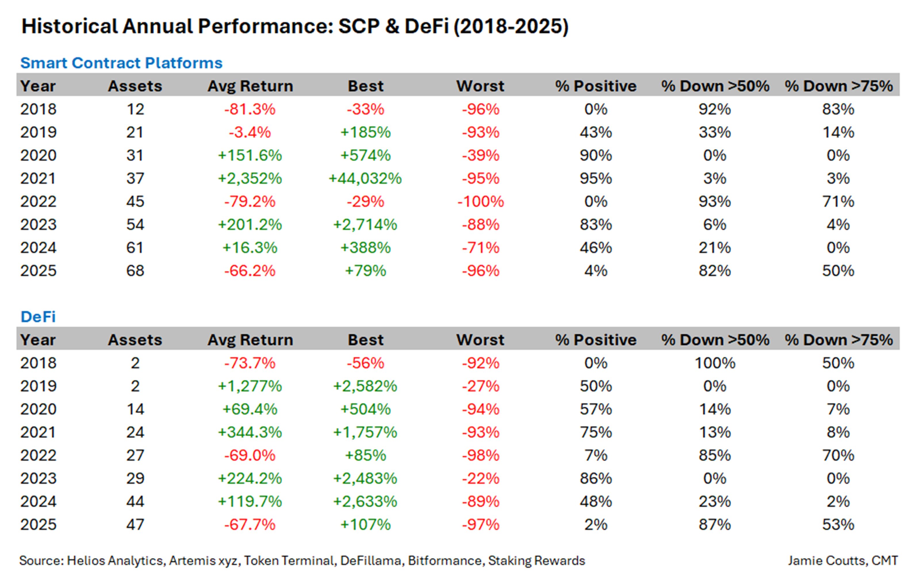 Excluding Bitcoin (BTC), 2025 turned out to be a bear market for the wider cryptocurrency market. Decentralized finance (DeFi) tokens fell 67% while cryptocurrencies associated with smart contract blockchains delivered a negative average return of 66%, according to blockchain data shared by Jamie Coutts, the chief crypto analyst at Real Vision.
