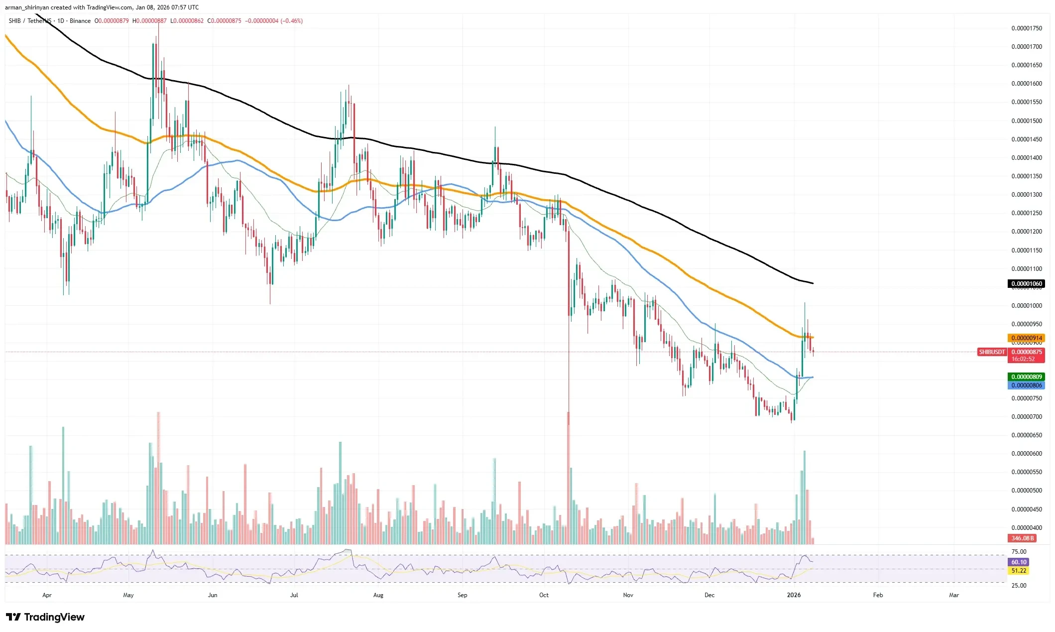 SHIB continues trading below significant long-term resistance levels. However, the bounce from recent local lows indicates shifting short-term momentum. The stabilization represents meaningful progress even though a complete trend reversal has not materialized.