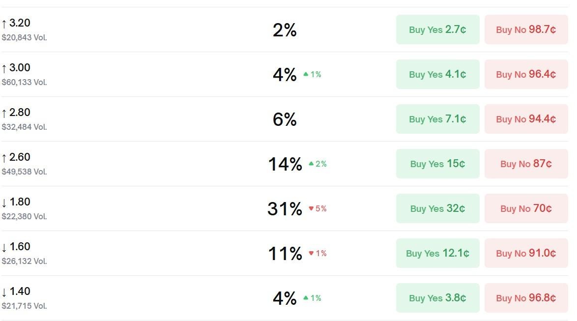 The other probable outcomes, per the odds on Polymarket, are $1.60 at 11%, $2.80 at 6%, $3, and $1.40 – both at 4% – and $3.20 at 2%. All other possible price levels are estimated either at 1% or at a lower than 1% chance.