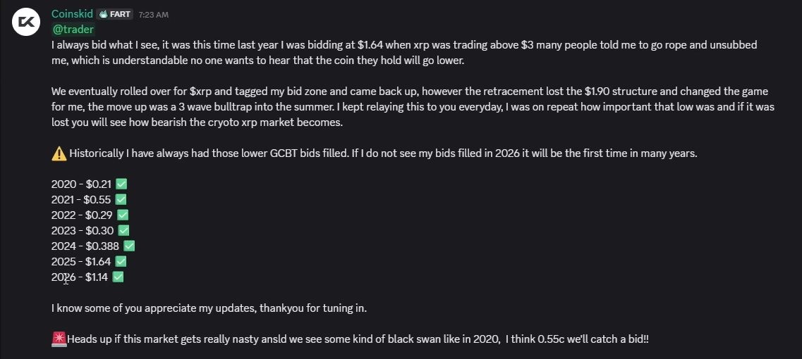 Now, CoinsKid believes this year, 2026, could feature a lower bottom of $1.14, and the current retracement may lead to this low price. In the Discord post, the analyst stressed that these bottom prices represent his bidding zones. However, when he called the $1.64 bottom last year at a time when XRP changed hands above $3, he faced criticism and intense pushback.
