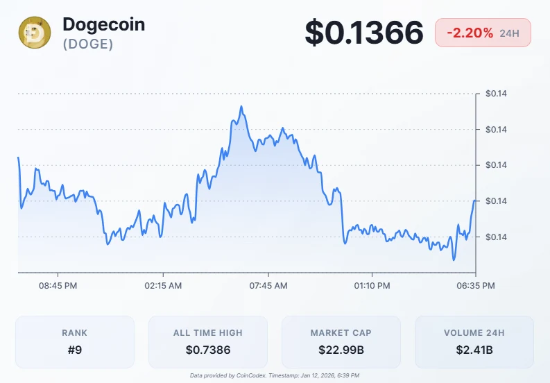 Over the past week, the Dogecoin price has shown a clear downtrend, starting around $0.147 and gradually declining to $0.1366 at the time of writing.