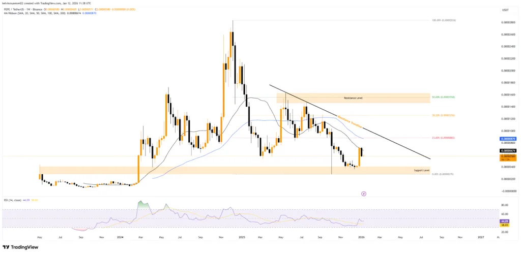 The 20-week moving average remains the first barrier, followed by the 50-week average near the 23.6% Fibonacci level at approximately $0.0000088. That zone also aligns with the long-standing descending resistance trendline, making it a pivotal point for assessing renewed strength.