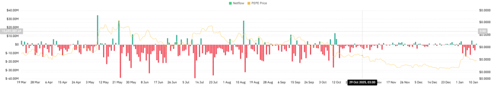 For now, PEPE’s price sits at a crossroads defined by the failed push above the 20-week moving average. Broader market rotation, weakening momentum, and persistent resistance continue to weigh on the chart, while subtle on-chain signals hint that some long-term holders remain patient beneath the surface.