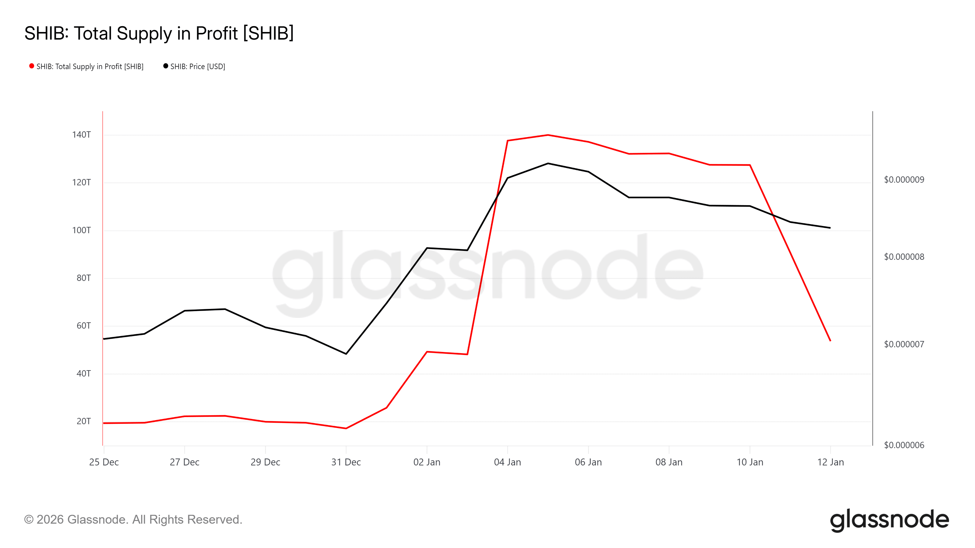 The decline marks a stark reversal from early January optimism. On-chain metrics reveal the extent of damage to investor positions. At the start of 2025, approximately 140 trillion SHIB tokens were held in profit. This figure reflected strong sentiment following December's rally when the token briefly touched $0.00001000 on December 5.