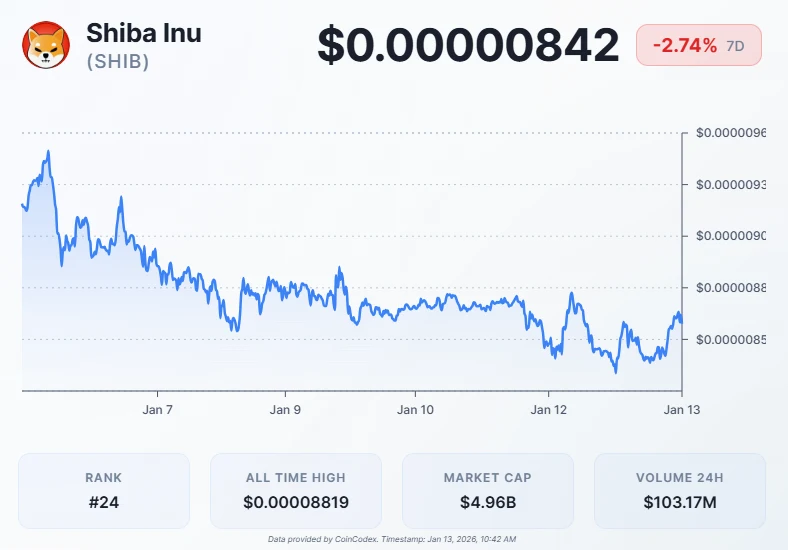 Shiba Inu has experienced a severe price correction over the past week. The meme coin erased most of its recent gains, triggering widespread selling among holders. SHIB currently trades at $0.00000842, down 2.74% from its position seven days ago.