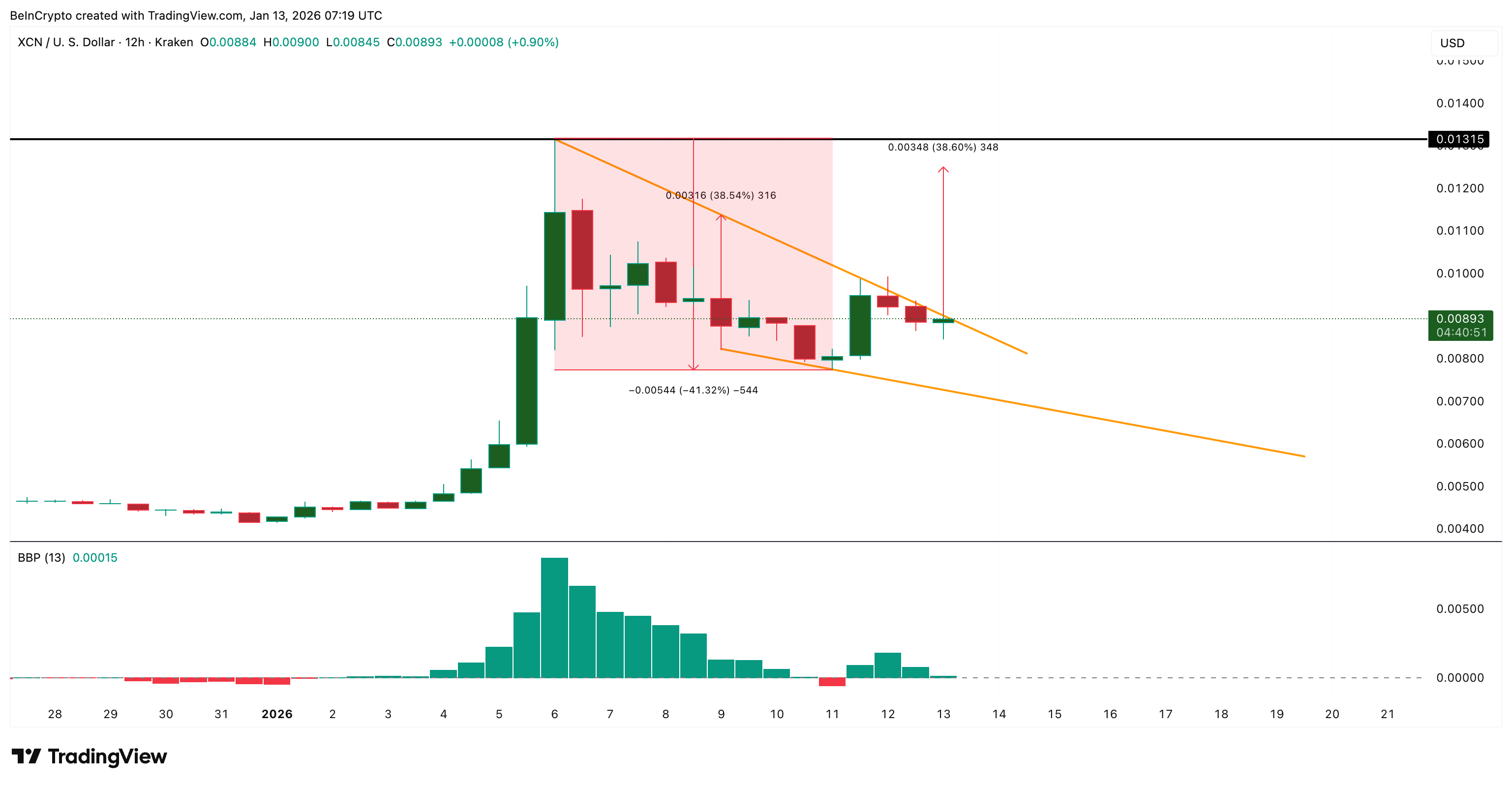 However, momentum has weakened near the upper boundary of the wedge. Bull–bear power, which measures whether buyers or sellers control short-term price swings, remains positive but has started to fade as the price repeatedly tests resistance. Since January 11, XCN has been rejected multiple times near the upper trend line, explaining why the rally stalled and weekly gains were erased.