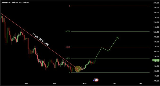 Crypto analyst NekoZ highlighted a potential trend reversal following a prolonged downtrend on the daily chart. The chart showed SOL breaking above a descending trend line that had limited rallies since November, after forming a rounded base near the $120 area and stabilizing into early January.