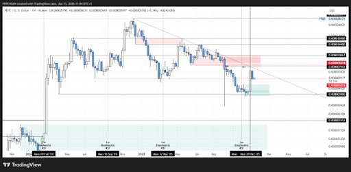 The crypto analyst stated that this would happen if the PEPE price pumps into the January 15 to February 15 window. He further explained that the meme coin needs to be at the unfinished monthly candle in that time window in order to invalidate this. An invalidation would send PEPE higher first, and then the bottom would be in. If that doesn’t happen, it may have one more hurdle to overcome.