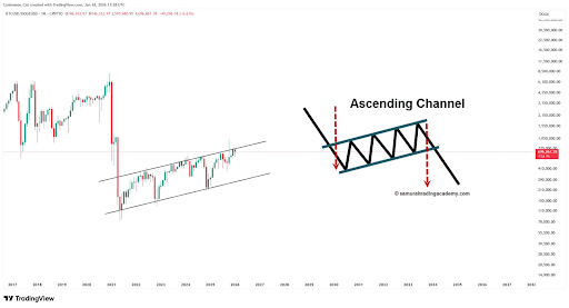 Technical analysis of the BTCUSDT/DOGEUSDT chart shows the two crypto heavyweights trading in an ascending channel that has repeatedly tested its upper boundary without a convincing breakout, a sign that the uptrend may be weakening. In technical trading frameworks, failure to sustain momentum at resistance often precedes a reversal.