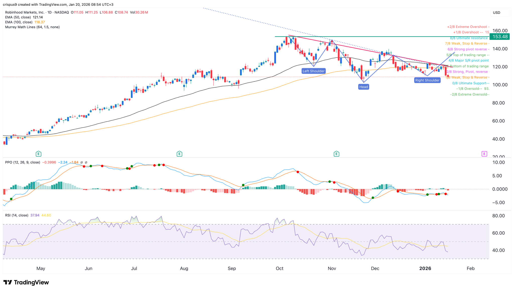 Robinhood stock has moved below the 50-day and 100-day Exponential Moving Averages (EMA), a highly bearish sign in technical analysis.