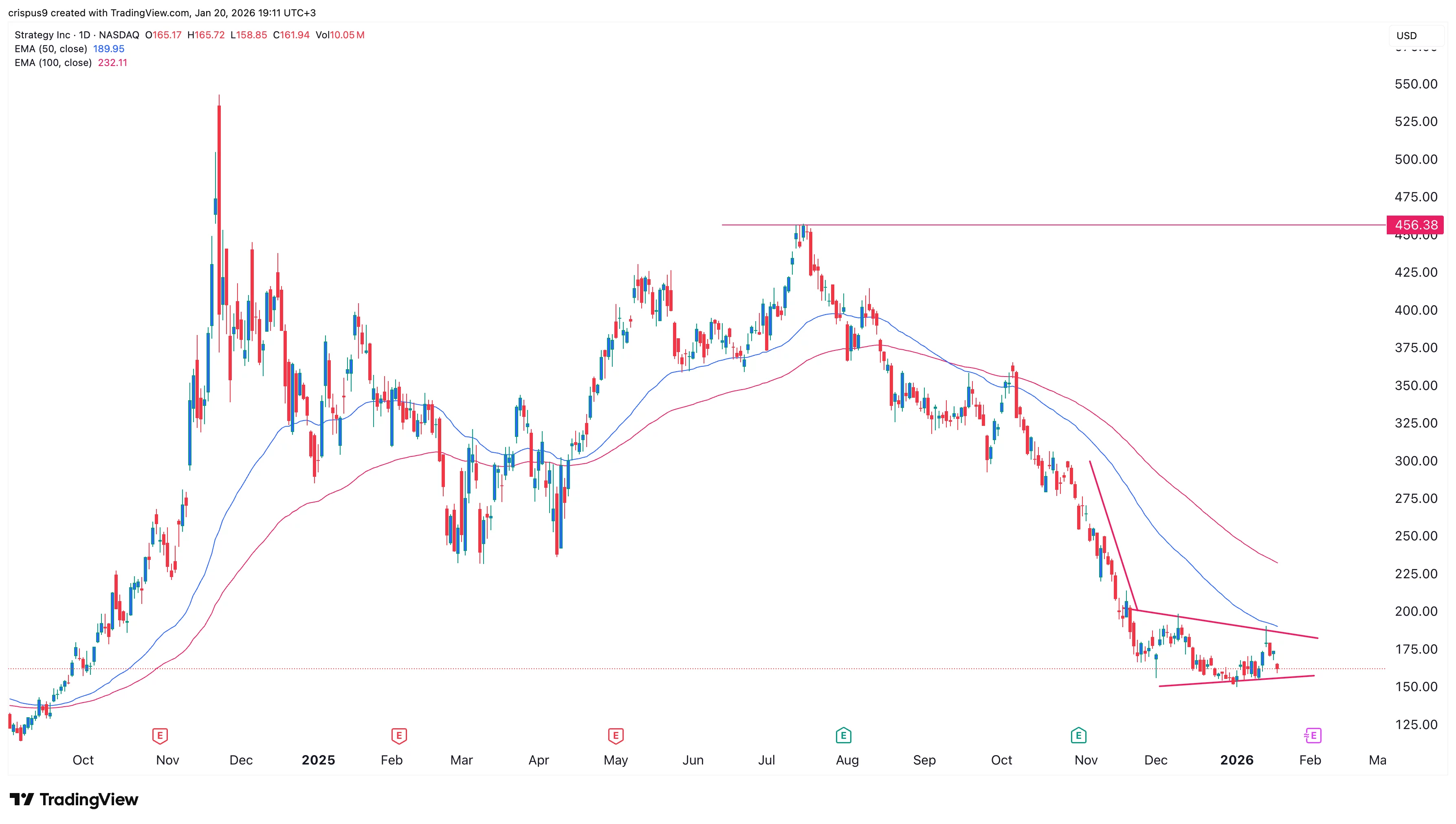 The daily timeframe chart shows that the Strategy stock price has pulled back in the past few months, moving from a high of $456 in July to the current $160.