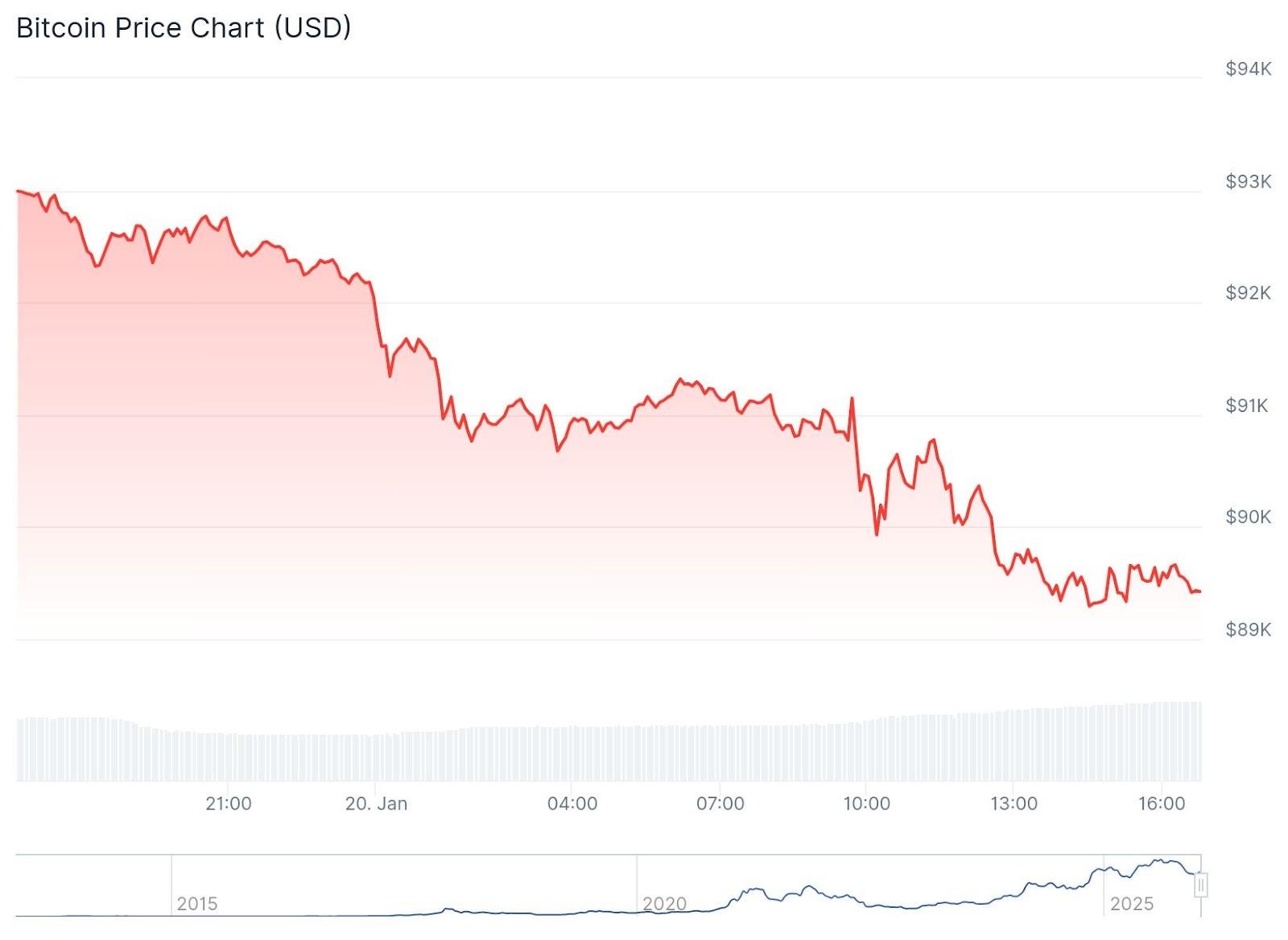 Crypto markets fell on Tuesday, Jan. 20, as trade-war fears tied to President Donald Trump’s Greenland tariff threats intensified.