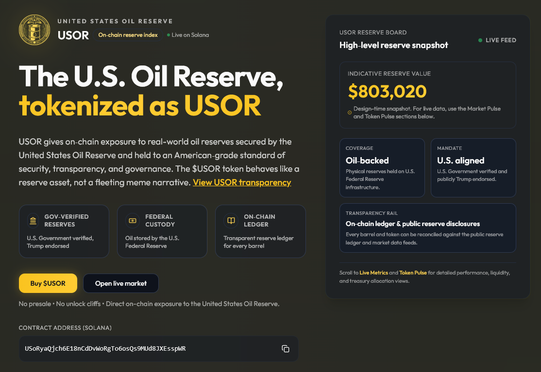 The project’s website claims USOR represents an “on-chain reserve index” that tokenizes US oil reserves, describing itself as oil-backed, US-aligned, and governed by public transparency.