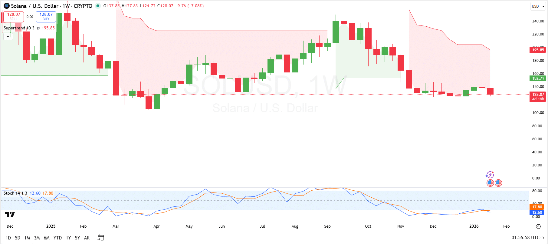 While Solana has demonstrated resilience over 30 days, its weekly technical indicators present mixed signals. Specifically, the Stochastic Oscillator indicates oversold conditions, suggesting the potential for a short-term rebound or consolidation at lower levels.