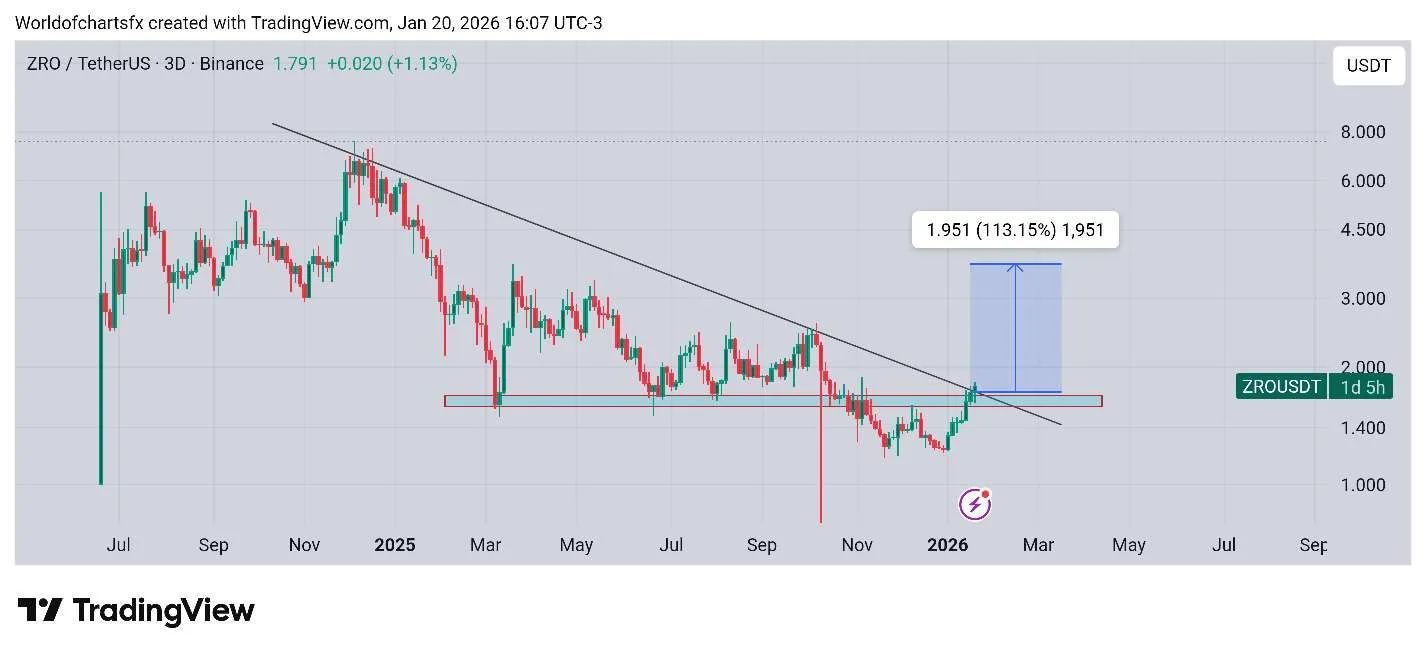 From a technical perspective, ZRO trades near the resistance of a descending parallel channel. The price rebound has brought the token to a critical resistance area that traders watch closely. A daily close above that channel, with strong volume and momentum, could open the path toward higher levels.