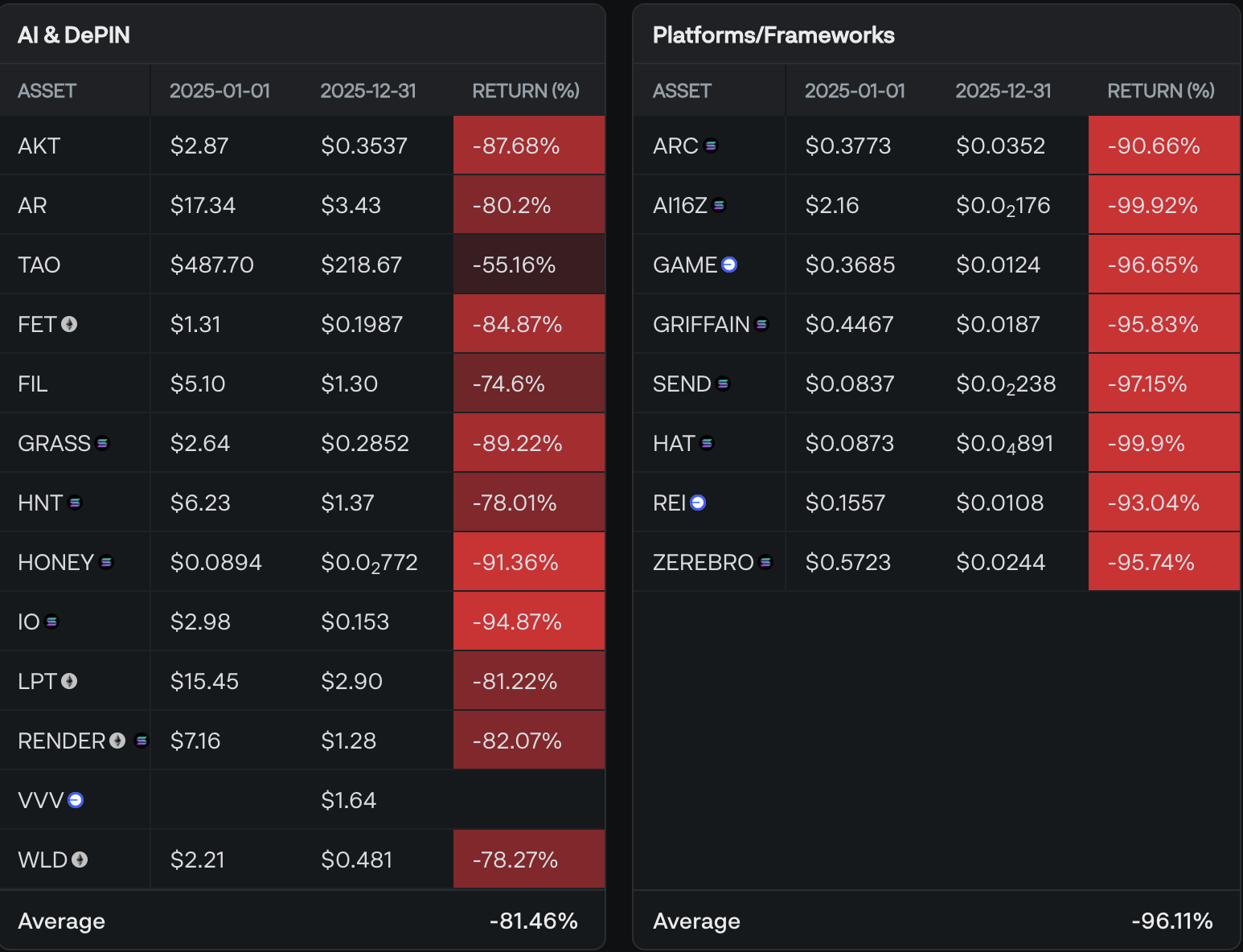 Data from Delphi Digital shows that DePIN and AI-related tokens lost more than 80% on average in 2025, making the category the fifth-worst performer overall and trailing only modular projects, gaming, agents, and frameworks.