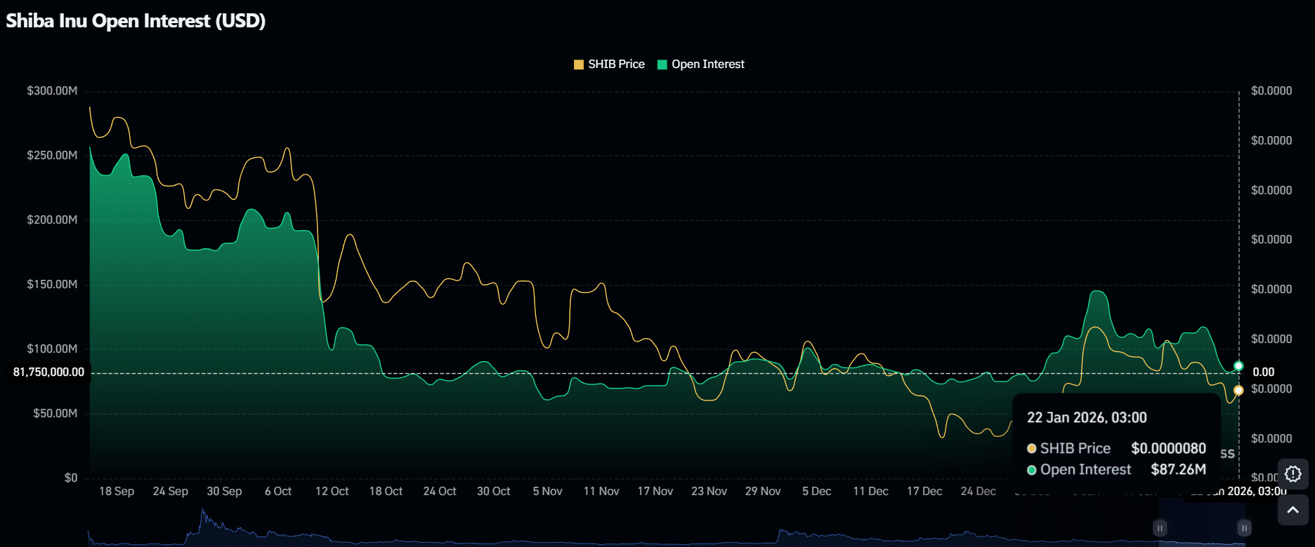 However, after peaking at around $145M and declining to $82.25, a positive shift has started to emerge. The open interest has begun to recover and is now sitting at approximately $87.26 million as of January 22, 2026.
