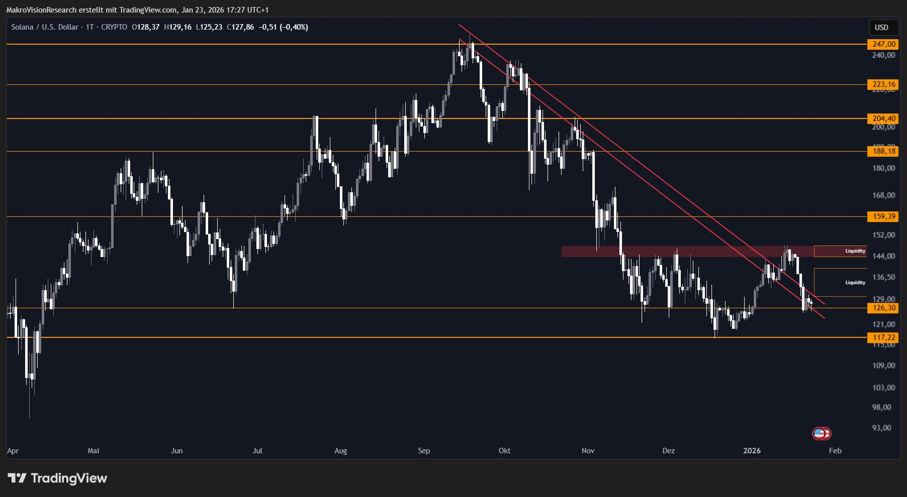 According to MacroVision, caution is advised as long as the Solana price remains below the red resistance zone. The $126 level is considered crucial in the short term, and a new upward breakout attempt could be possible if this support holds.