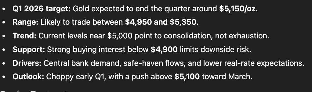 According to ChatGPT, gold is expected to end Q1 2026 at approximately $5,150 per ounce, with a projected trading range between $4,950 and $5,350.