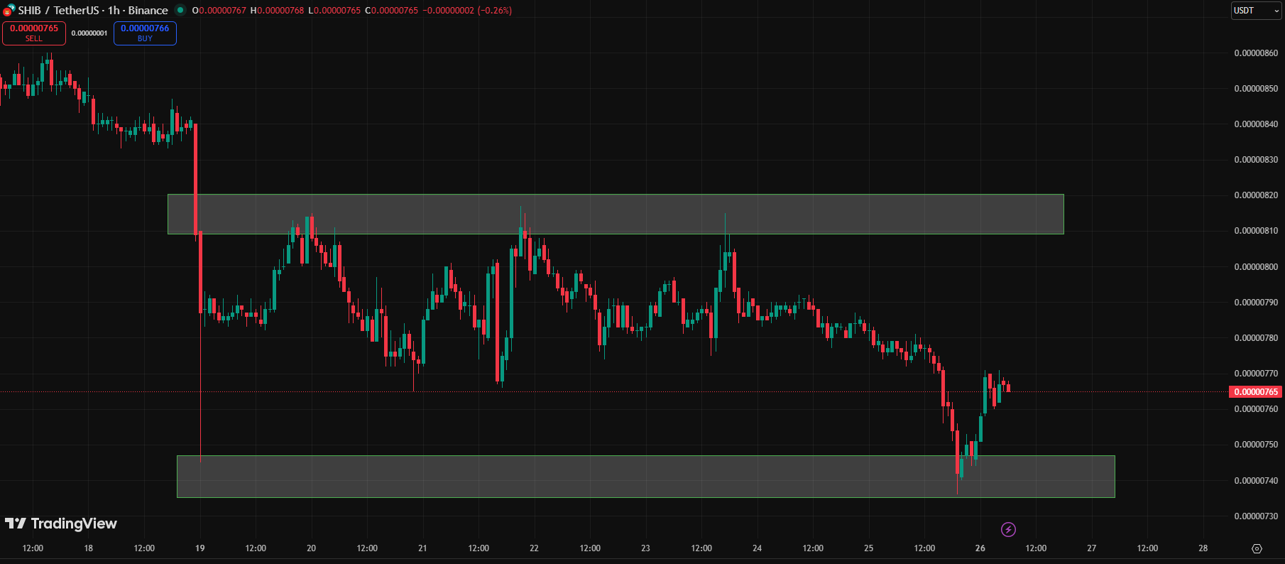 So long as SHIB continues to trade above this lower-timeframe support, it has a chance of a price recovery. Moreover, repeated rebounds from this area show that bulls view it as a key price point; hence, they step in to prevent the price from falling below it.