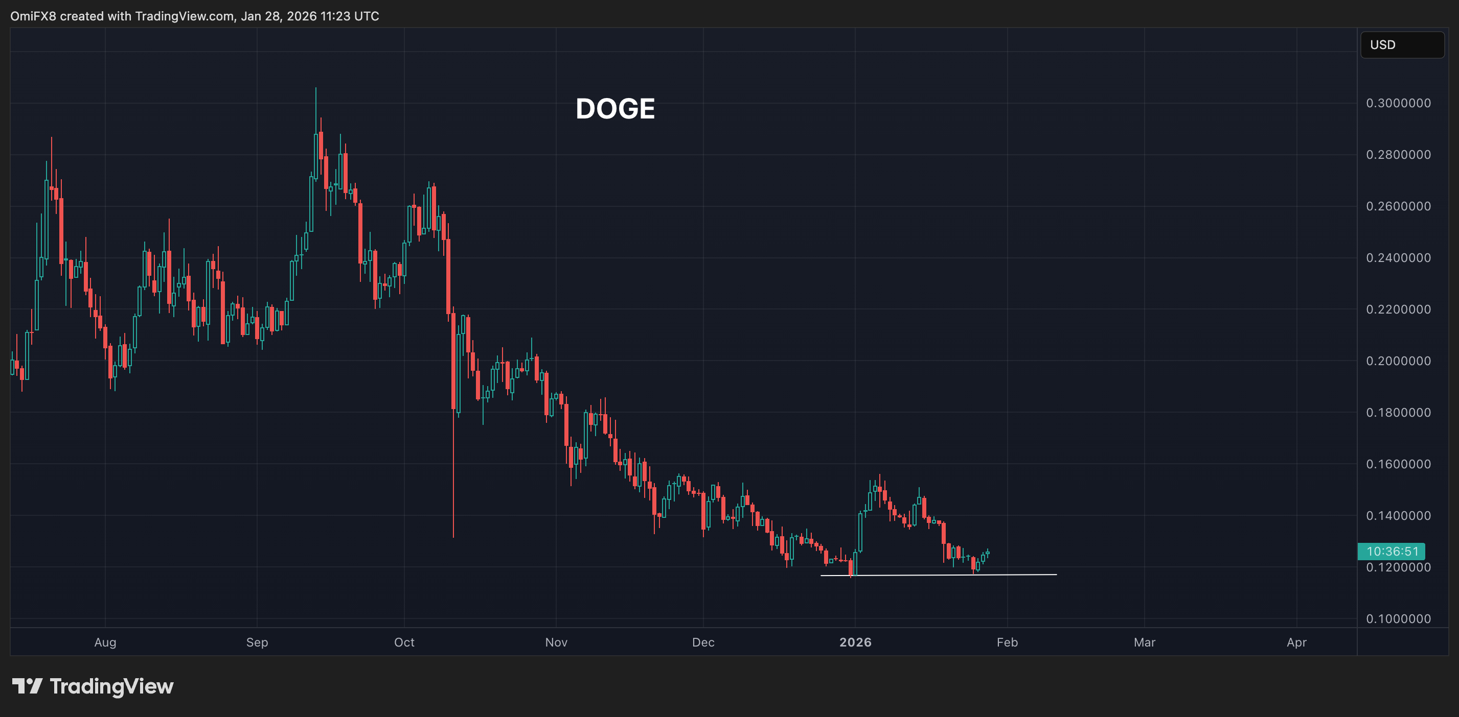 - The chart shows dogecoin's ($DOGE) daily price swings in candlestick format.