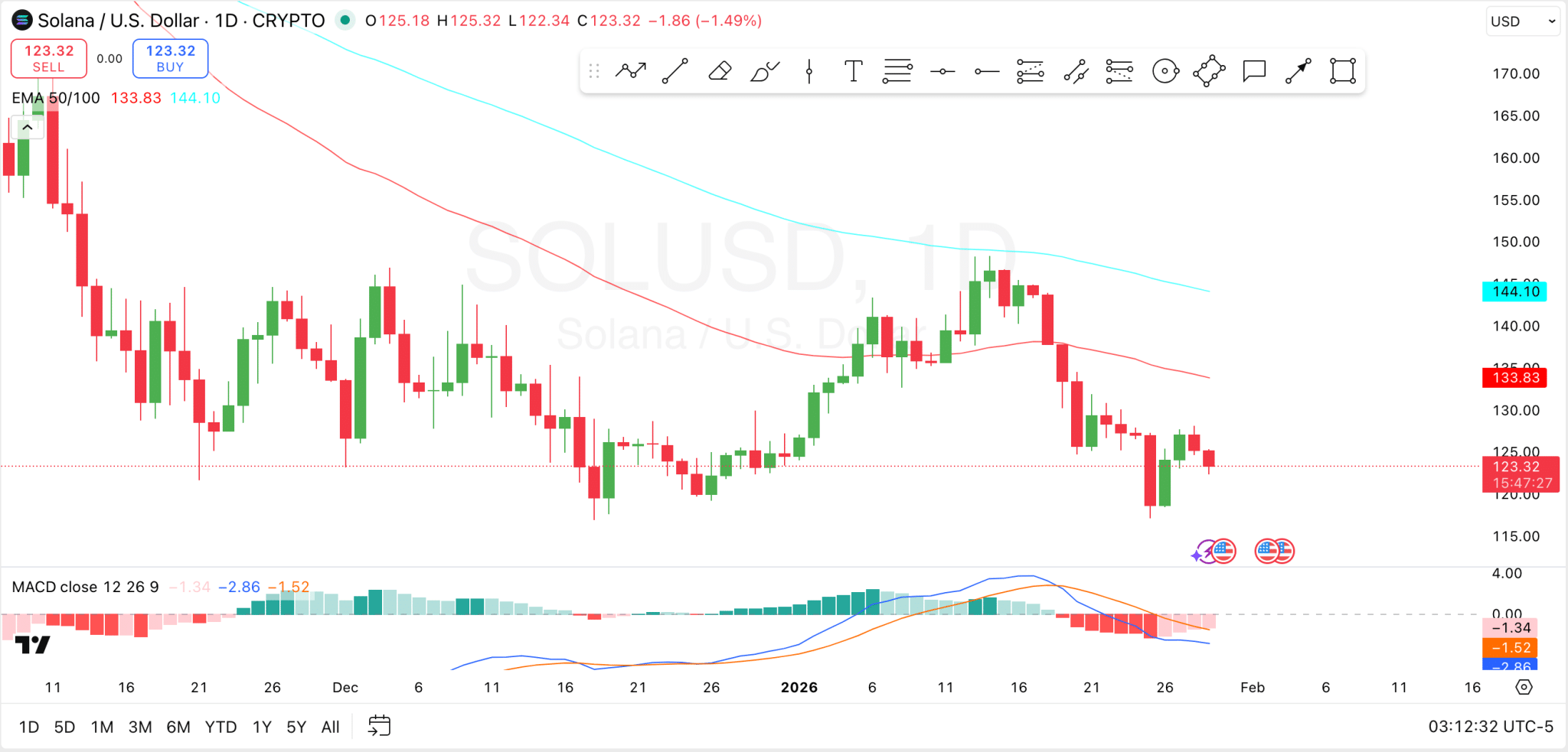 On TradingView, Solana is currently showing some bearish signals based on its technical indicators. The price is trading below both the 50-day and 100-day Exponential Moving Averages, with the 50-day EMA at $133.83 and the 100-day EMA at $144.10.