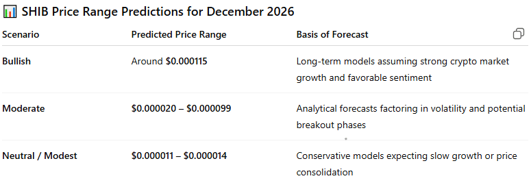 ChatGPT, drawing on estimates from several analytical platforms, places $SHIB in a modest range of $0.000011–$0.000014, implying potential gains of 52%–93% from current levels.