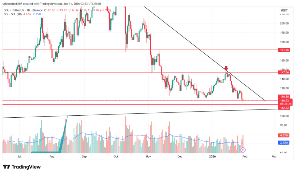 Currently, the $SOL price seeks support at a long-coming trendline of $116.8, evidenced by the long-tail rejection candle in today’s candle. If the support holds, the price could jump roughly 6% before it challenges the downsloping trendline, intact since September 2025.