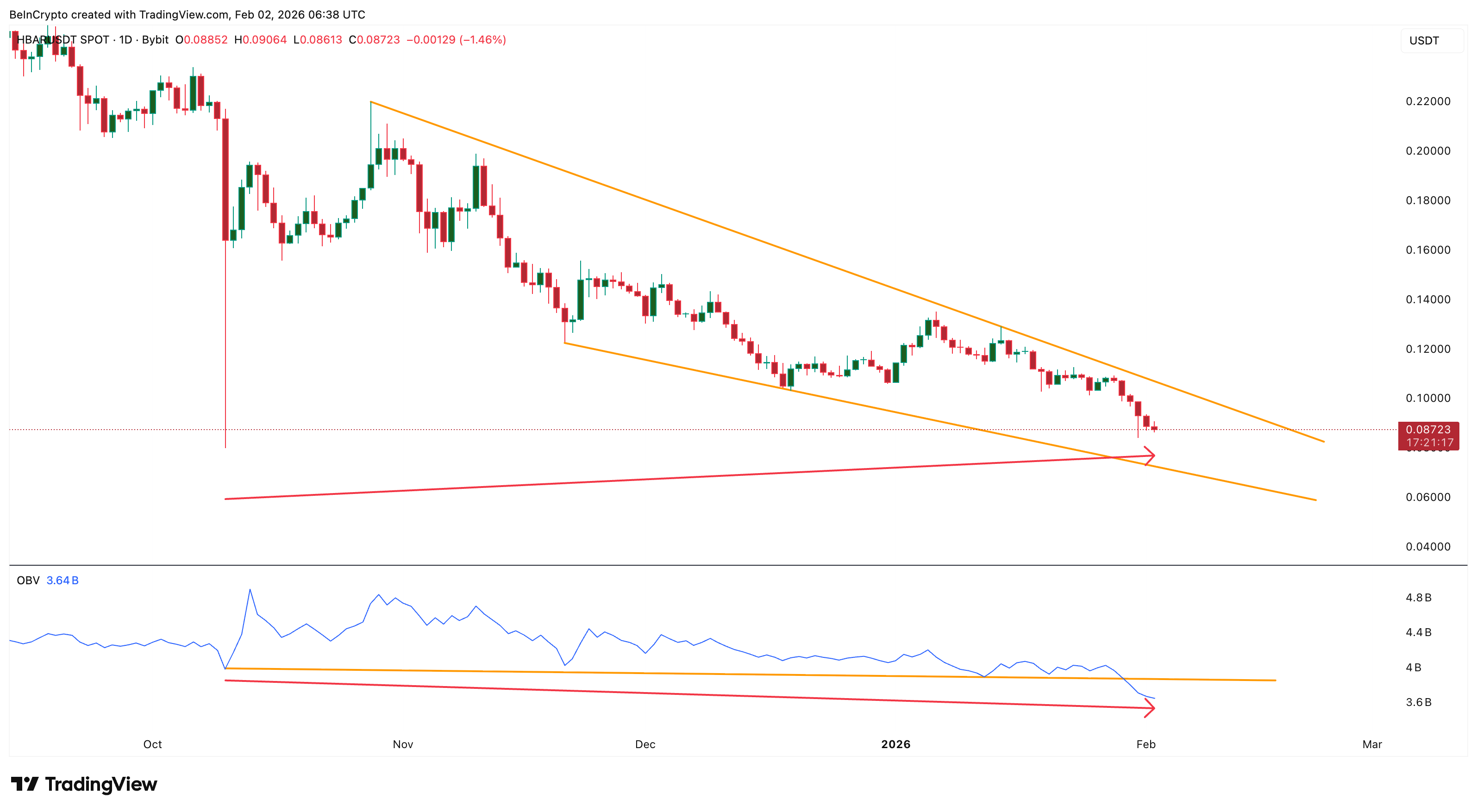 The On-Balance Volume (OBV) indicator measures whether volume supports price trends. Rising OBV confirms buying strength. Falling OBV signals distribution. In $HBAR’s case, OBV has been weakening.