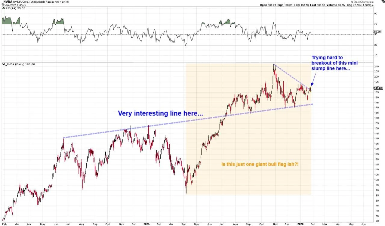 The chart highlights a tightening structure that continues to favor upside continuation. NVDA trades within a rising trend that has held since mid-2024, while pullbacks repeatedly respect the same ascending support line. As a result, downside attempts lose momentum quickly, and price compresses rather than breaking lower.