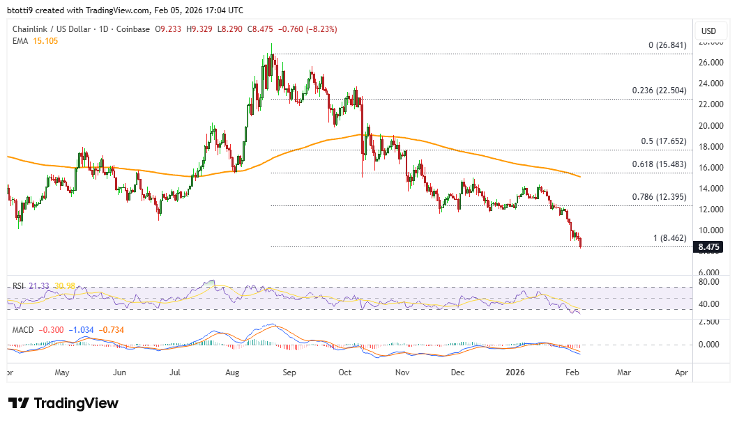 Chainlink mirrored the broader cryptocurrency market’s dump on Thursday, February 5, 2026 as $LINK reached multi-year lows last seen in October 2023.