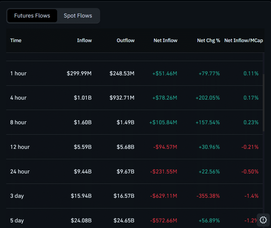 Elsewhere, the data presented on Solana futures flows indicates a short-term recovery in market sentiment. In the past hour, Solana has seen a net inflow of $51.46 million, reflecting a 79.77% change.