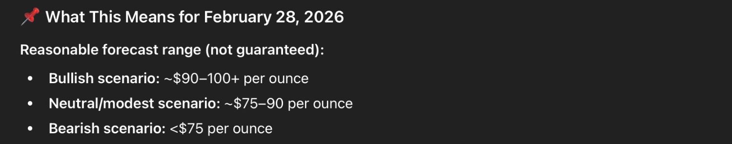 The chatbot prefaced its forecast with a warning that sharp swings could be likely, but it concluded that the base-case scenario could see silver changing hands at $75–90/oz.