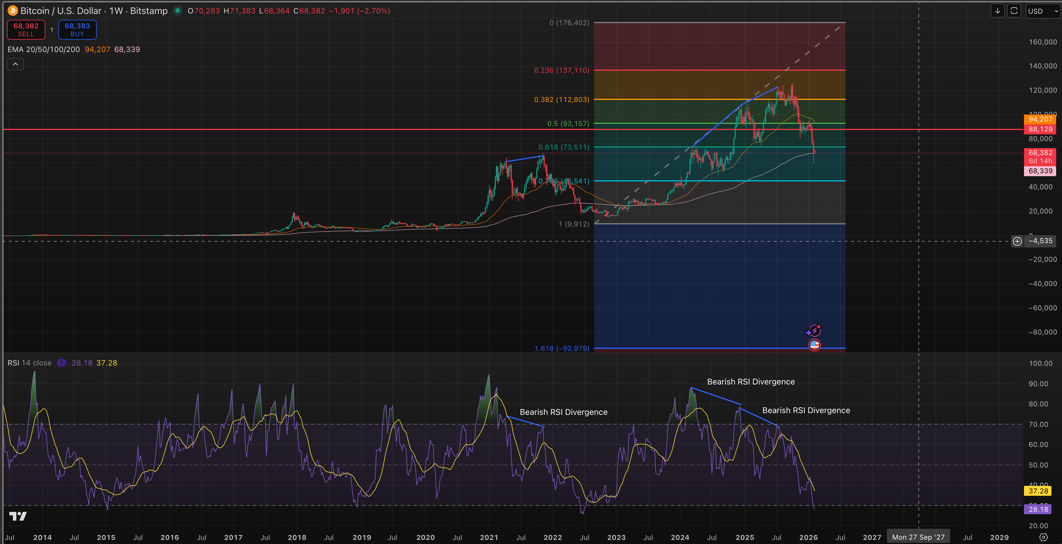 • The weekly RSI is firmly oversold at 28.18, a level that has historically preceded short-term rebounds.