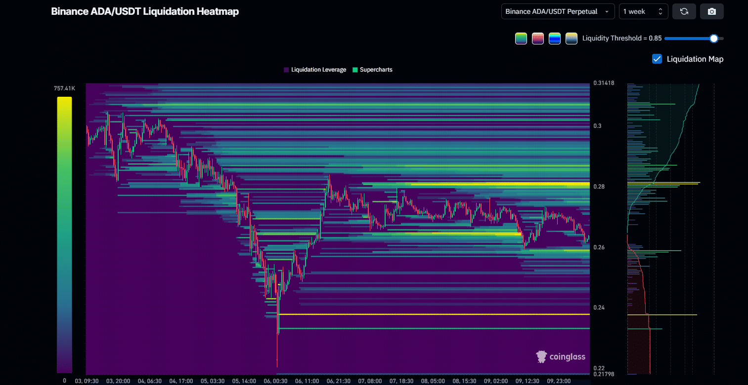 Under these circumstances, $0.25 would be an optimal entry point for a long position, as $ADA would complete a double bottom if the rebound materializes. This could push the coin toward $0.30, above which there is more liquidity to capture.