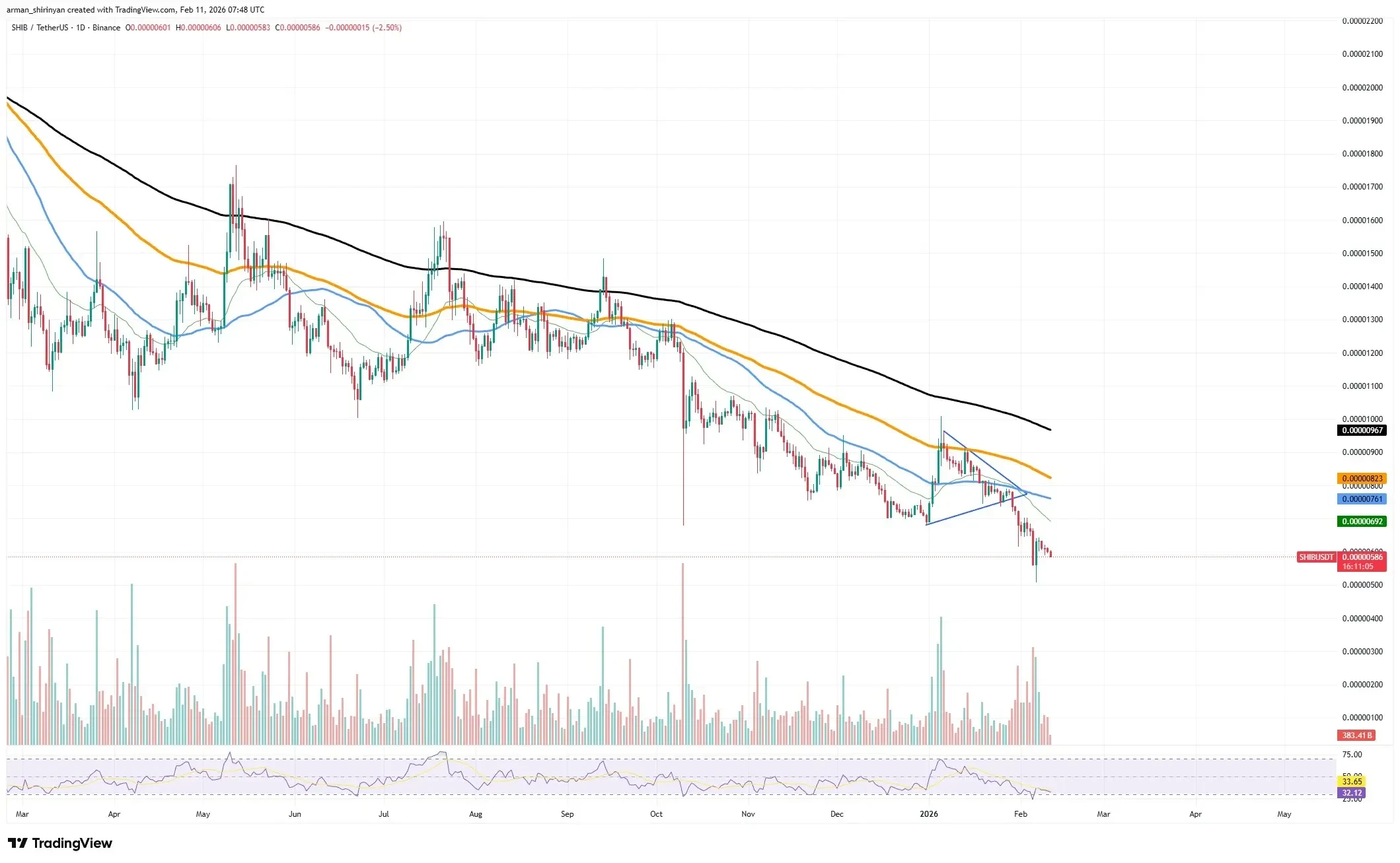 $SHIB trades in oversold territory. At the time of writing, $SHIB trades at around $0.000005817, suggesting a 2.68% decline in the last 24 hours.