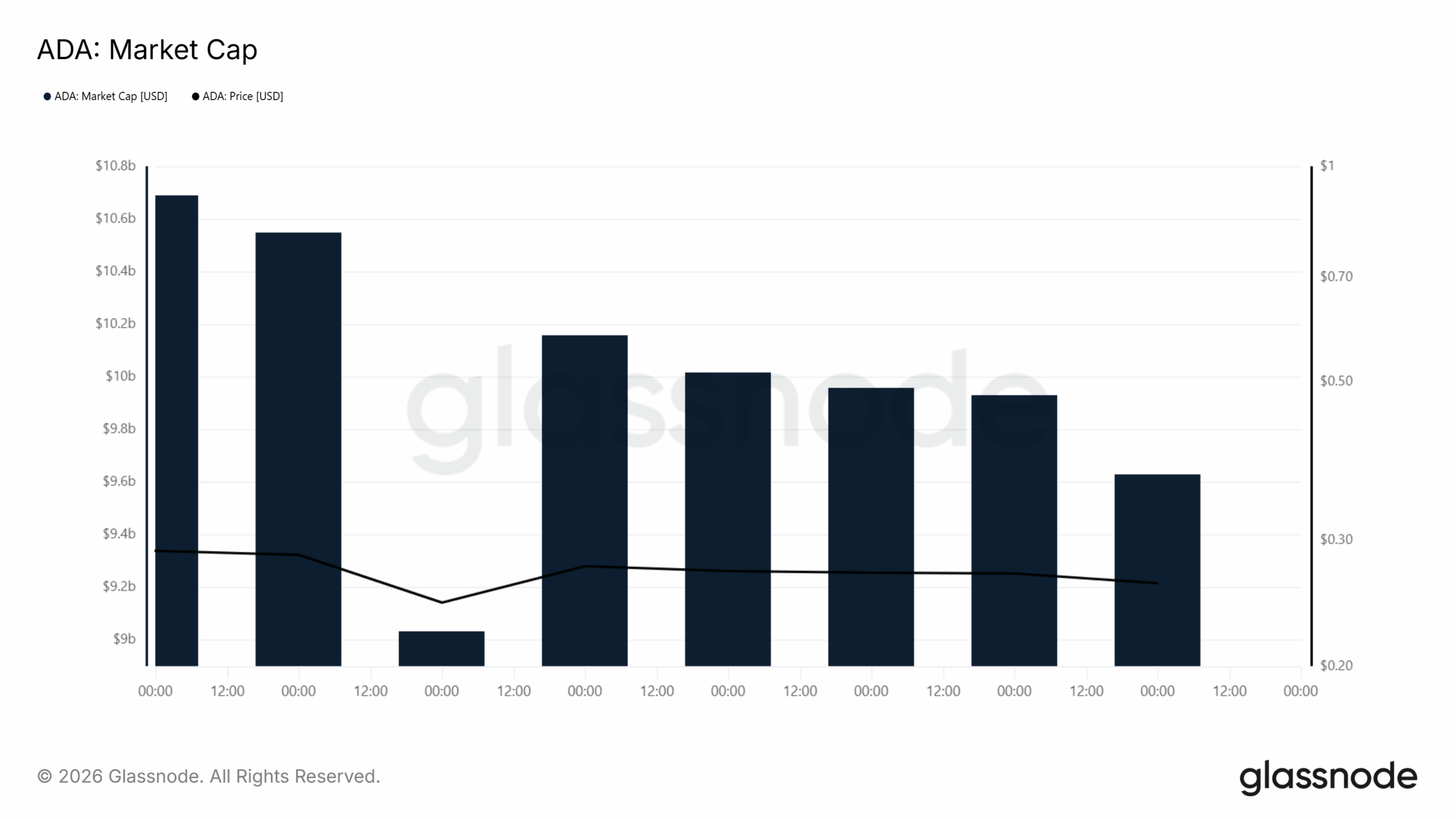 A chart provided by Glassnode, monitors the $ADA market capitalization as well as the $ADA price in USD terms. According to this chart, the $ADA valuation has been declining steadily, reducing over time, though not abruptly.
