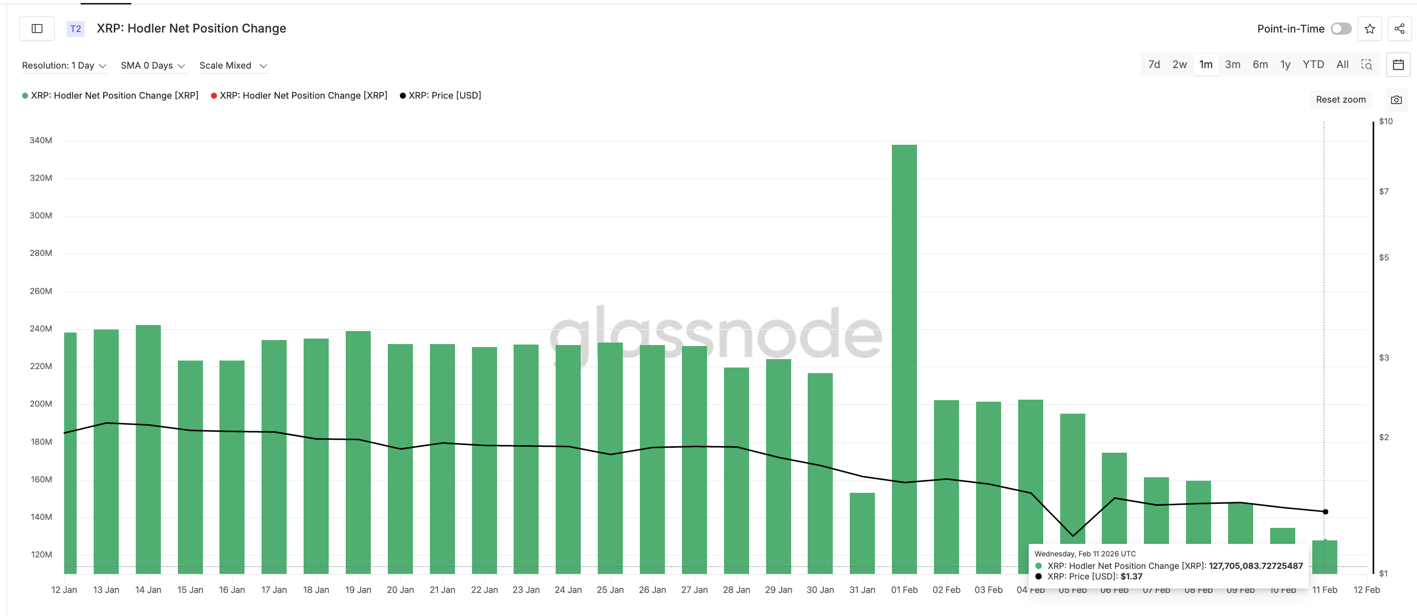 On February 1, long-term holders were adding around 337 million $XRP. By February 11, their accumulation had fallen to about 128 million $XRP.