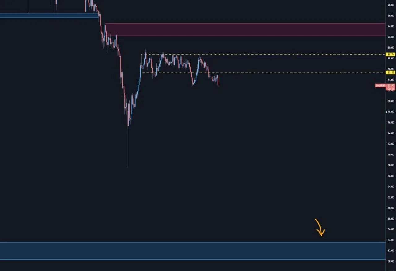 The chart also marks overhead supply near the low-to-mid $90s, where a prior breakdown started. At the same time, the blue zone near the low-$50s highlights a deeper demand area from earlier price history. While that zone sits far below current price, its placement shows where prior buyers stepped in after heavy sell pressure. In the near term, the loss of the $85–$86 area keeps pressure on rebounds and leaves $SOL exposed to further downside if follow-through selling builds.