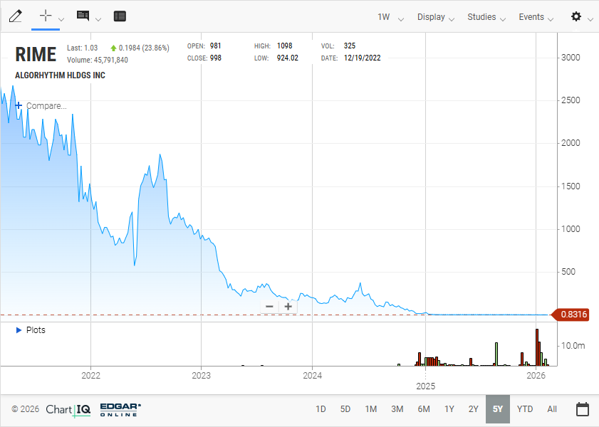 Algorythm Holdings (RIME) traded near a five-year low, and not even the hype around its potential AI product could lift its stock price. RIME traded at around $1 after the news. Before switching to the AI narrative, Algorhythm Holdings sold consumer-oriented karaoke equipment.