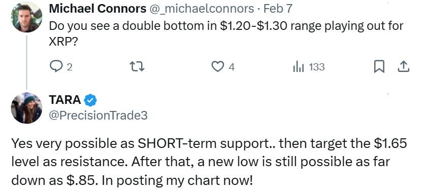 Crypto analyst Tara outlined a short-term rebound scenario before warning that broader market weakness could trigger another leg lower. She described $1.30 as potential interim support and $1.65 as resistance during a retrace before renewed downside risk emerges. In response to a question on X about a possible double bottom in the $1.20-$1.30 range, she replied: “This could bring $XRP down to ~$1.30 as short-term support with another wave up expected as high as the .5 at $1.65- now turned resistance.” She further cautioned: