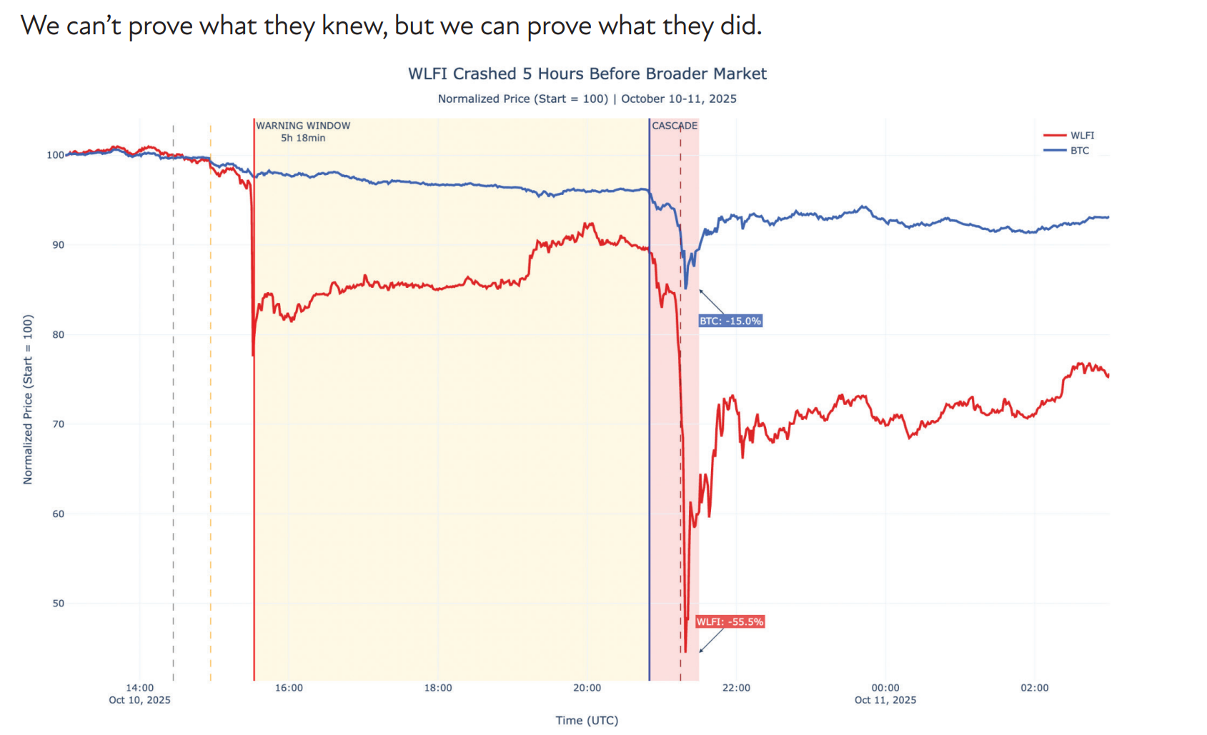Researchers analyzed three unusual patterns, including a surge in trading activity, a sharp divergence from Bitcoin and extreme leverage, to determine whether $WLFI signaled stress before the broader market selloff.