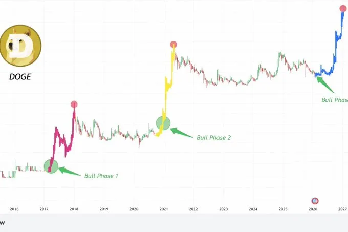 Historical cycle analysis adds another layer to the discussion. In earlier bull markets, $DOGE delivered significant multiples. The first major cycle produced a 95x move. The second cycle surged roughly 310x. Market participants now speculate about what a third cycle could bring if the broader crypto market turns favorable.