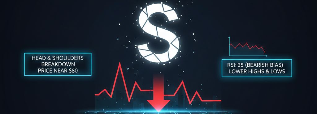 - Solana breaks down from a “head and shoulders” pattern, trading near $80.
