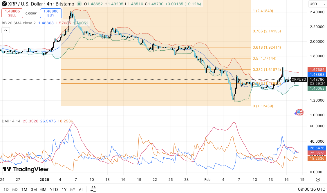 Moreover, price attempts to reclaim the Bollinger mid-band near $1.4886. A sustained move above that level would confirm short-term stabilization. However, momentum still faces several resistance barriers before any broader trend reversal unfolds.