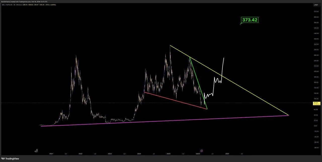 A weekly Solana U.S. dollar chart from Coinbase showed $SOL trading near $85.76 at the latest candle. The chart marked two prior cycle lows in 2022 and early 2023, then highlighted the current pullback in early 2026. Despite the drop, price stayed within the broader range that formed after the 2023 rebound.